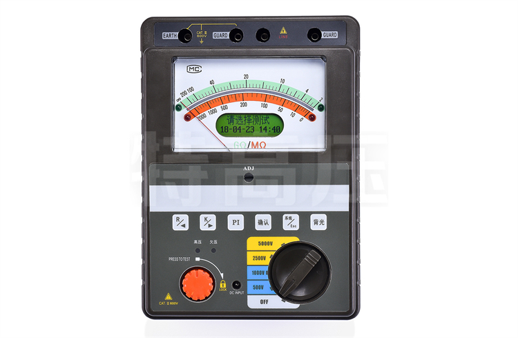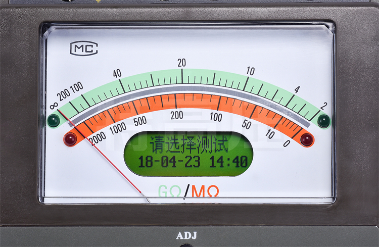• 2、兩種方式同步顯示絕緣阻值。機械指針采用超薄型張絲結構抗震能力強。機械指針的采用可容易觀察絕緣電阻的變化范圍,點陣液晶屏的采用可指導用戶操作儀表并可精確得出測量結果。